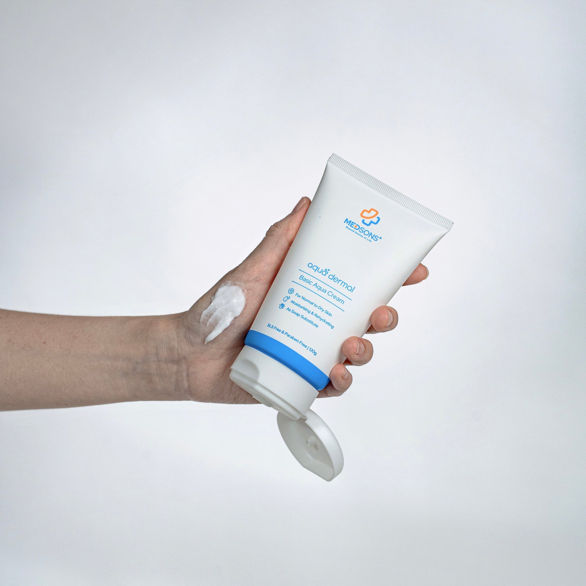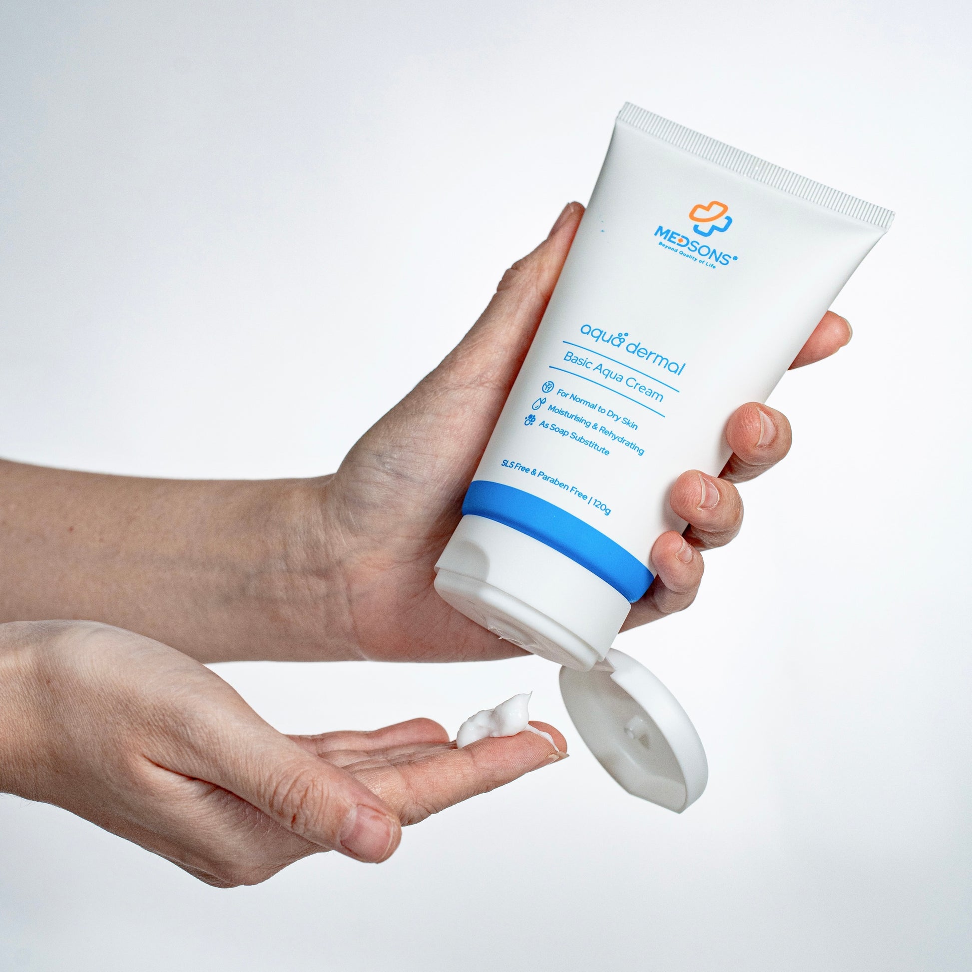 DESCRIPTION: Medsons Basic Aqua Cream is a light and non-sticky dual-action cream for dry, sensitive, and irritated skin. It helps maintain the skin’s natural moisture balance and can be used as a soap substitute without stripping natural oils. It effectively moisturizes very dry skin, soothes itches caused by dry skin, and acts as a gentle makeup remover for sensitive skin.